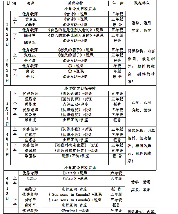 1、地方名师、国家名师“同课异构”——“同中求异,异中求同”,引发参与者智慧的碰撞,互相学习,取长补短,共同提高教育教学水平。