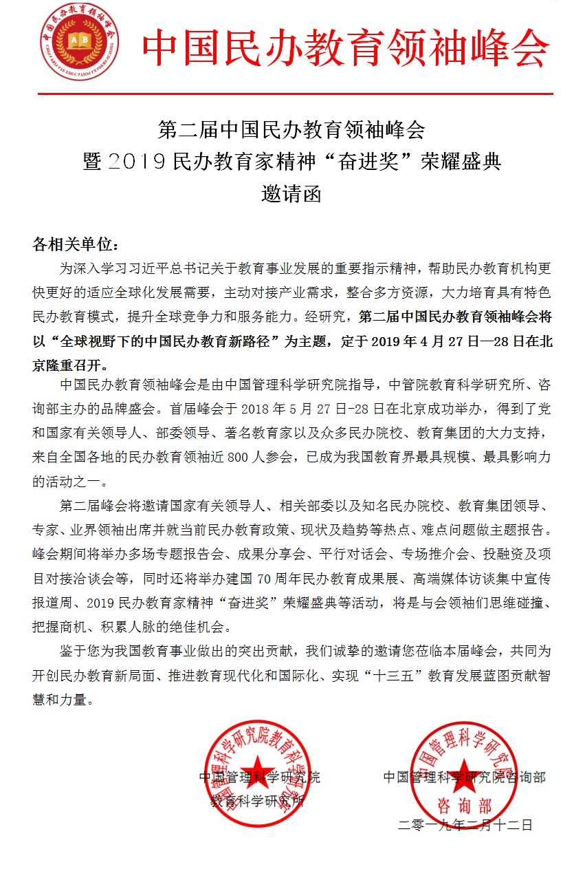 第二届中国民办教育领袖峰会暨2019民办教育家精神“奋进奖”荣耀盛典邀请函