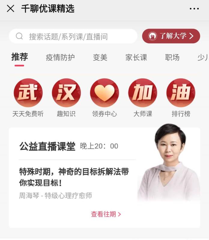 中国管理科学研究院教育科学研究所心理健康研究中心在千聊平台设置了心理学公益课程,每次课程约上万人,引起了良好的社会反响,也造成了比较大的公共影响力。